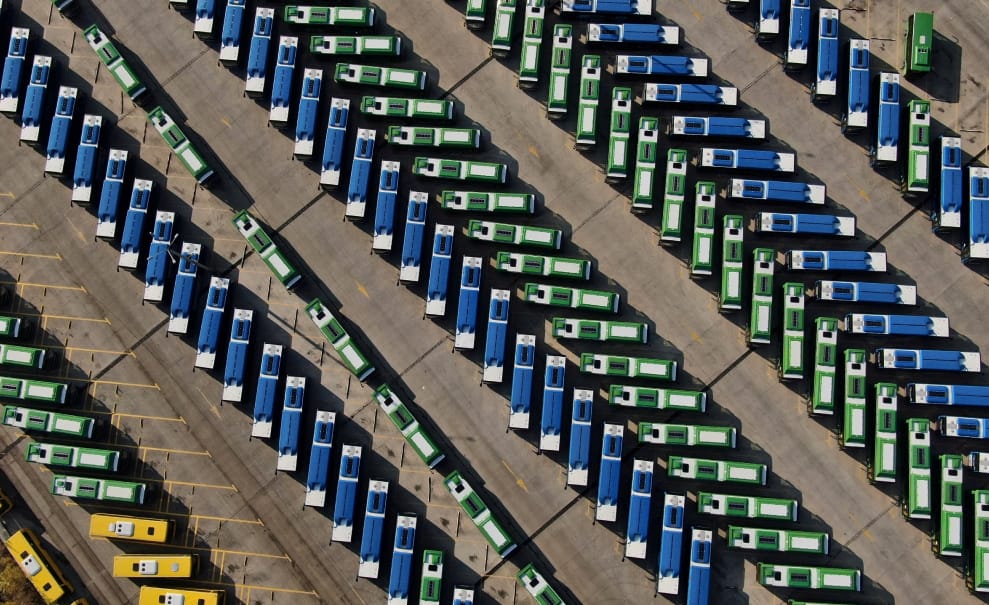 在首都提比利斯(Tbilisi)的巴士總站,大量巴士因為嚴格的COVID-19(武漢肺炎)禁令開不出去,只能全部停放在這裡。