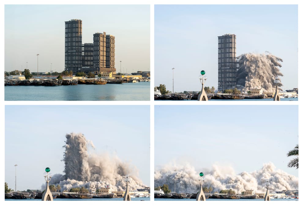 在這幅組圖中,記錄下阿布達比位於商業港口區Mina Zayed裡,一棟有 165公尺高、144層樓高的大樓在 10秒內被夷平的瞬間。