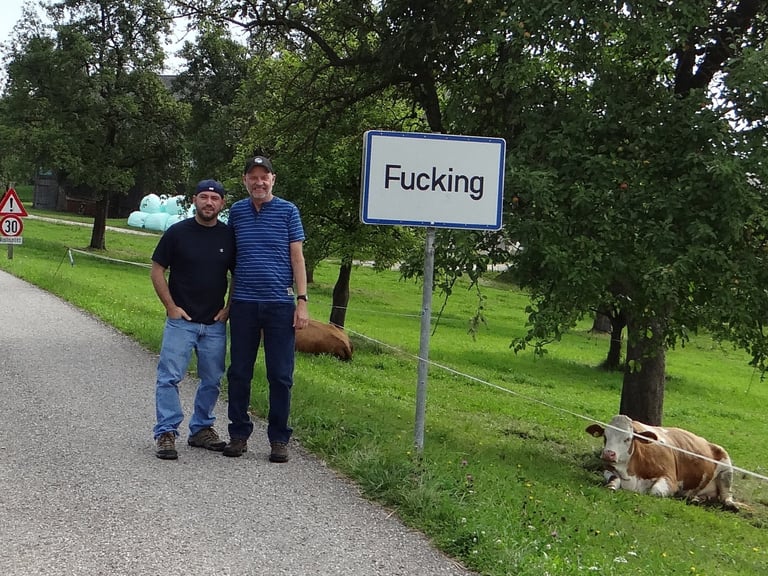 在奧地利薩爾斯堡(Salzburg)北方大約三十公里的地方,有一個名叫Fucking的小村落,這裡雖然人口只有一百多人,但常常吸引大批觀光客前來和印有「Fucking」字樣的路標合影。因為村名在英文中實在太不雅,受夠被當笑話的村民們總算決定改名,從 2021年1月1日開始,Fucking將從世界上消失,變成Fugging(如果用當地方言來唸,發音和Fucking相同)。