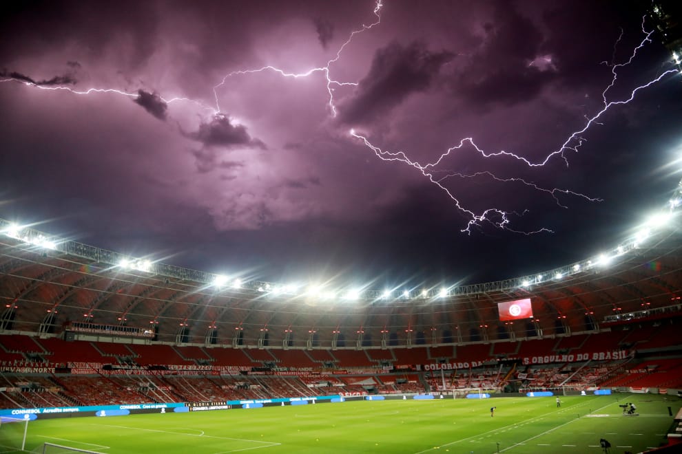 在巴西的足球場,一道照亮天空的閃電恰好被攝影師給收入鏡頭。