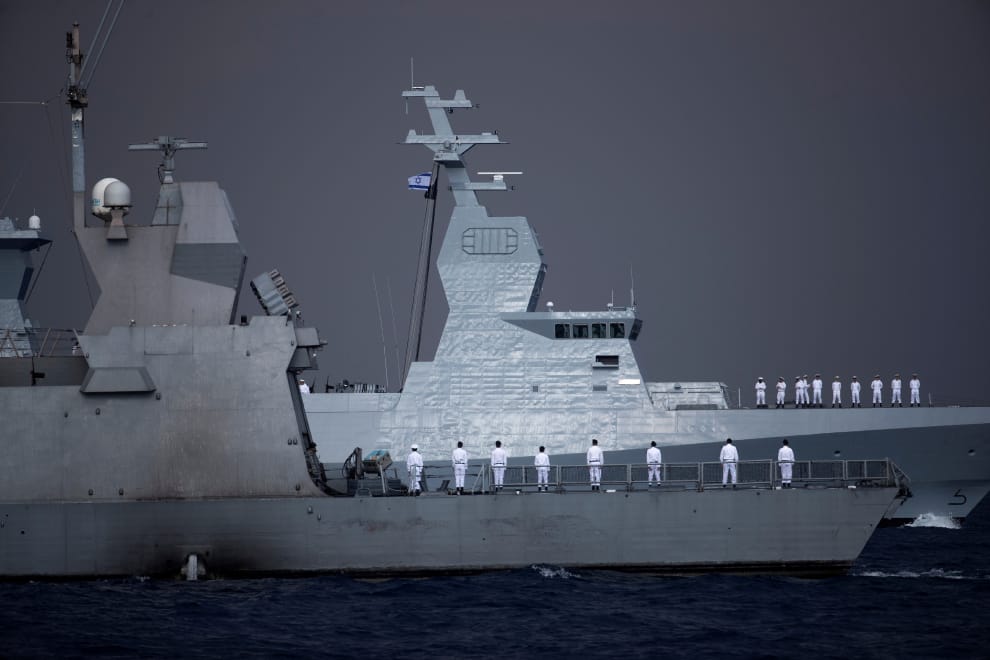 以色列水手站在薩爾 6型護衛艦(Saar-6 corvette,前)上,一同迎接被稱為「盾牌」(Shield,後)的戰艦加入他們。