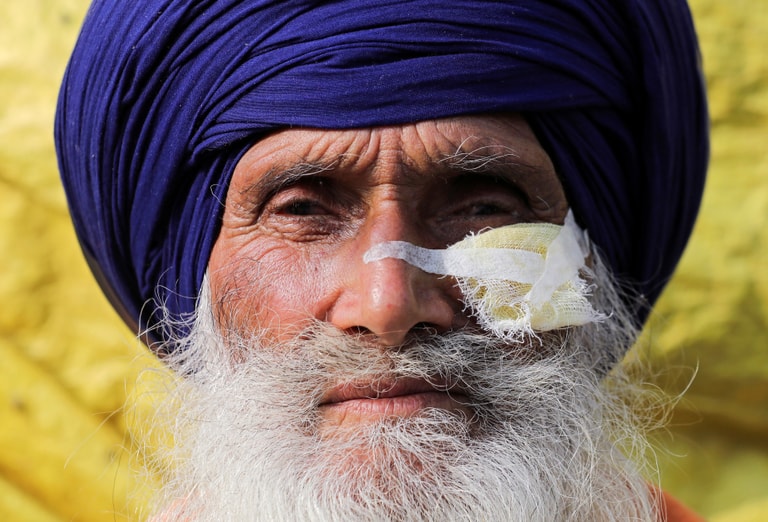 70歲的農夫辛吉(Santokh Singh)在上街示威的過程中,左臉被催淚瓦斯擊中受傷。