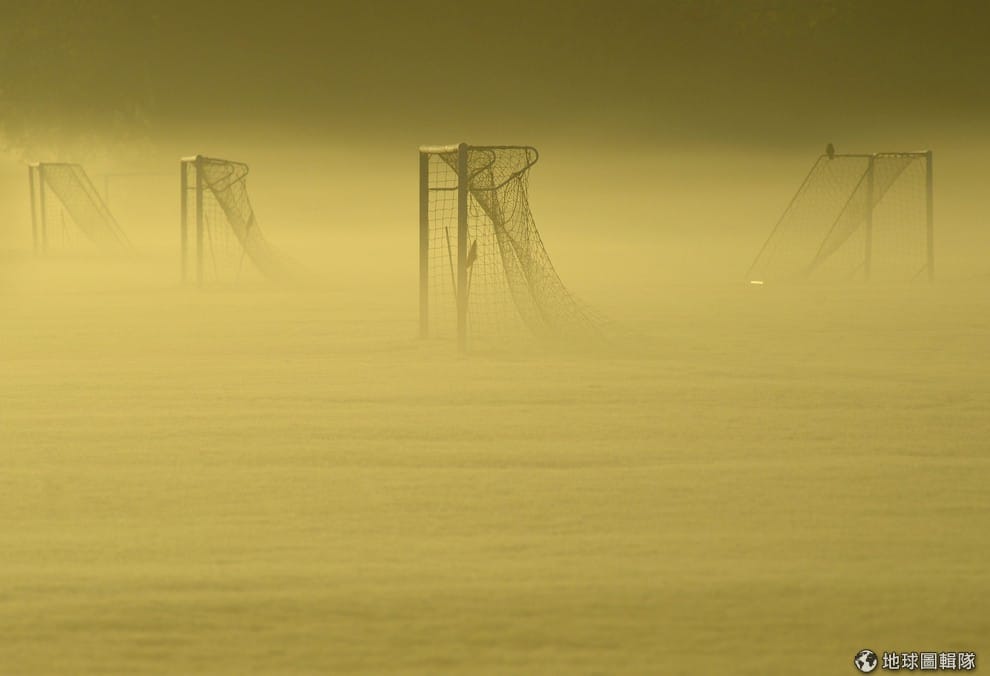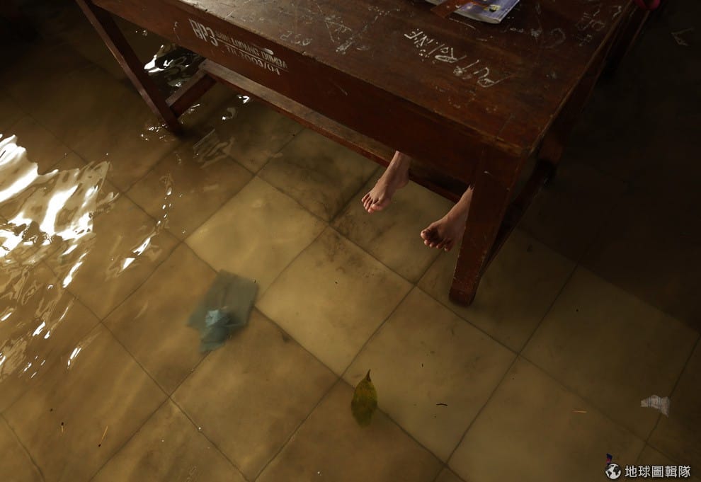 小學生的腳丫從桌子底上伸出來。當地過去7年來,每年都會在此時受到季風帶來的豪雨影響,變成水鄉澤國