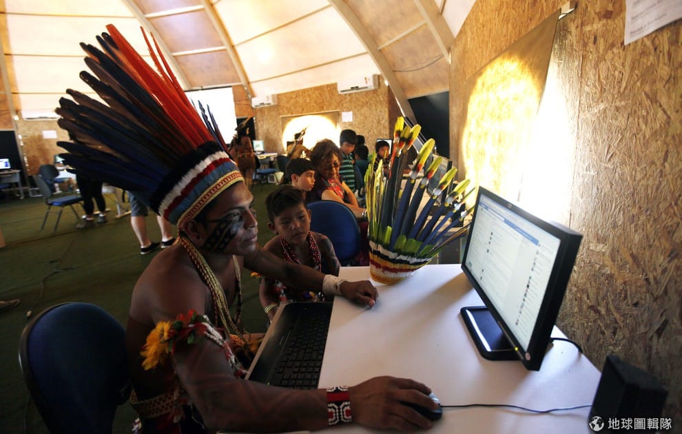 巴西當地的原住民政在帳棚中使用電腦。當地正是第12屆原住民競賽大會,總計有48個原住民部落會在大賽中比賽射箭、與圓木賽跑、泛舟等等...。這場大賽會一路持續到周六16號。