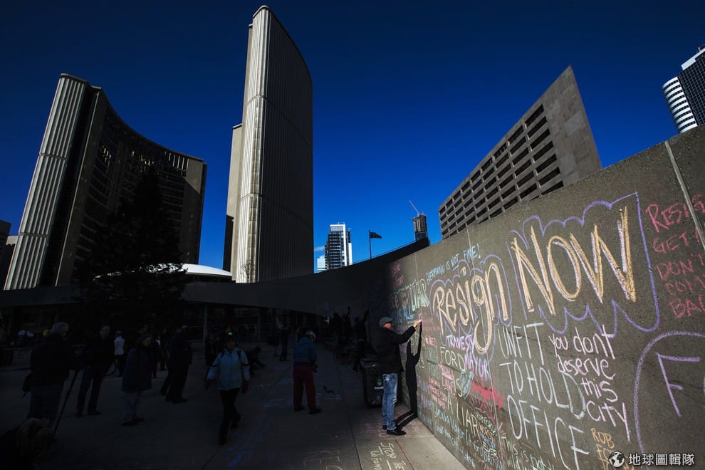 一名男性拿著粉筆在牆上留下對多倫多市長福特(Rob Ford)的意見。福特在近期表示對毒品和幫派絕不容忍,但他同時也承認自己在過去2年中有買非法藥品