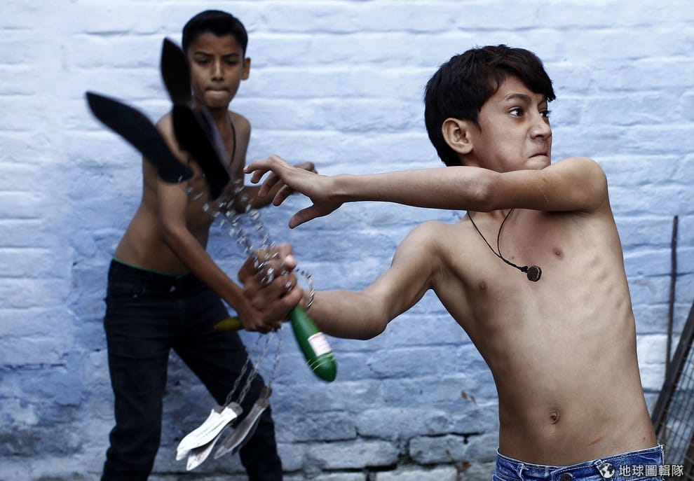 屬於伊斯蘭教什葉派的男孩們正在用刀鞭打自己。當地正是伊斯蘭教重要的阿舒拉節(Ashura)。這個節日是要紀念先知穆罕默德的孫子伊曼海珊在7世紀時被殺。