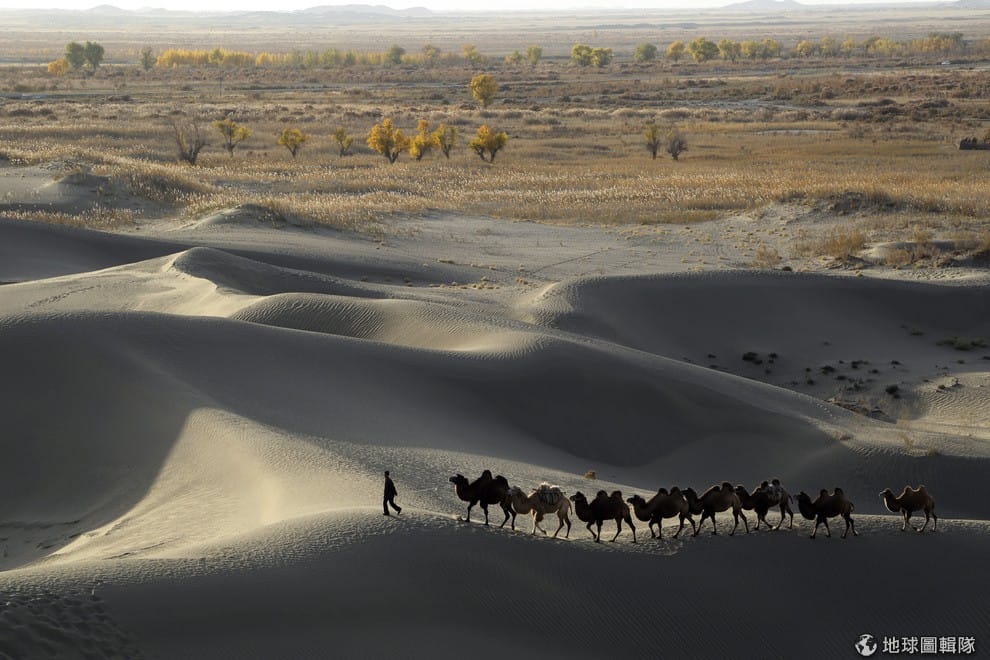 一名男子帶著駱駝隊伍走在塔克拉瑪干沙漠中