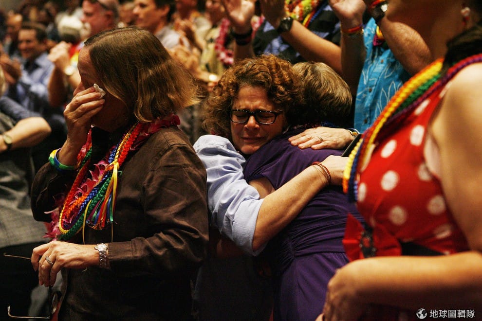 聽到同性婚姻法合法化後,照片中央的麥基(Eileen McKee)和凱洛琳( Carolyn Golujuch)感動相擁