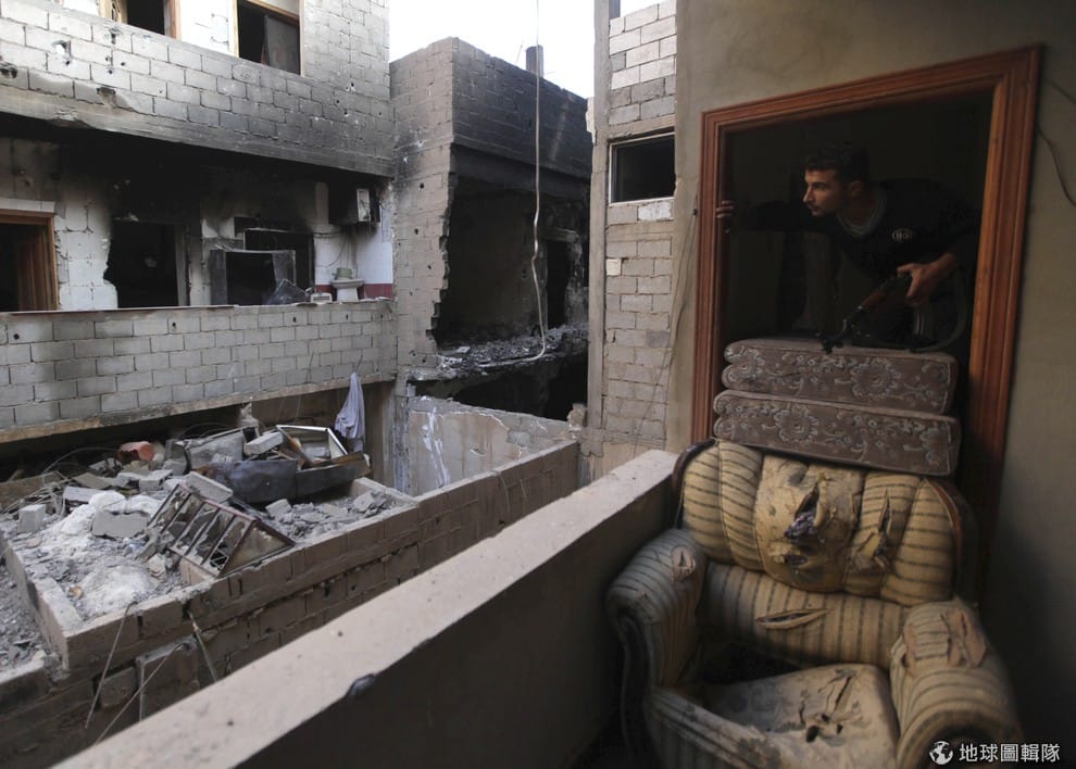 一名反政府的解放敘利亞軍人拿著武器從門口旁望出