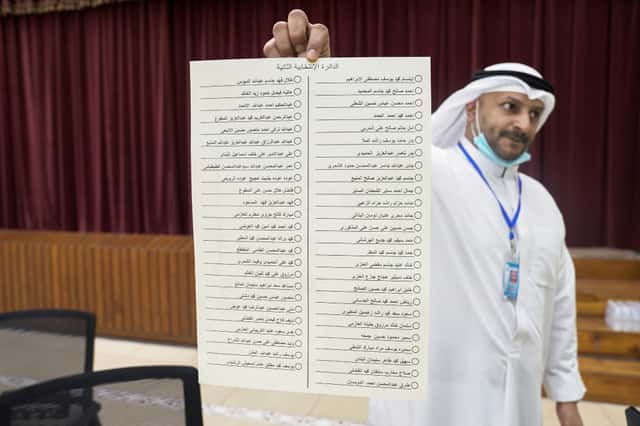 首圖故事:一名科威特選務人員對著鏡頭秀出科威特市第二選區的選票......