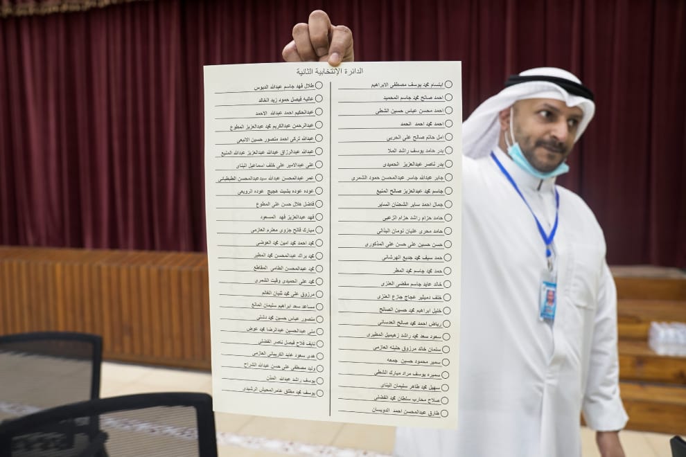 5號這天,是科威特君主納瓦夫一世·艾哈邁德·賈比爾·薩巴赫(Nawaf al-Ahmad Al Sabah)在九月登基以來,首次舉辦國會大選,由 326個候選人爭搶國會 50席。圖為一名選務人員在科威特市的第二選區秀出印有滿滿候選人姓名的選票。