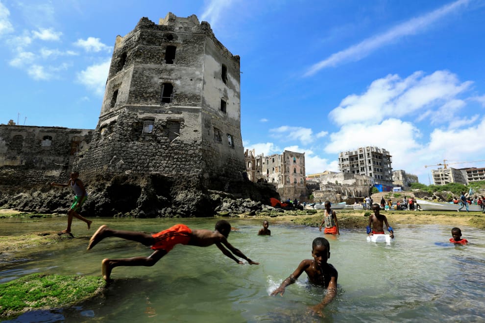 在首都摩加迪休(Mogadishu)的哈馬溫海灘(Hamarweyne beach),孩子們正在盡情戲水。