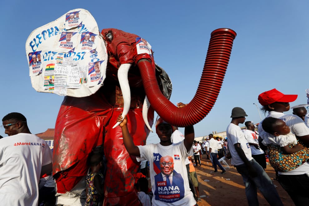 在迦納首都阿克拉(Accra),現任總統阿庫福-阿多(Nana Akufo-Addo)的支持者抬出自製大象為他助選。隸屬國家愛國黨(National Patriotic Party)的阿庫福-阿多將對上來自國家民主議會黨(National Democratic Congress)的馬哈馬,馬哈馬曾經擔任過迦納總統,兩人將在 7號舉行的總統大選正面對決。