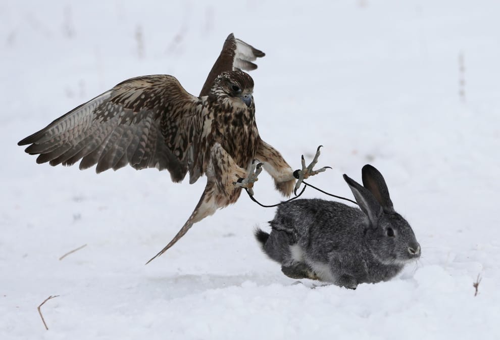 在哈薩克東南部的阿拉木圖州(Almaty region),一隻被馴服的獵鷹正在參加一場獵捕兔子的比賽。