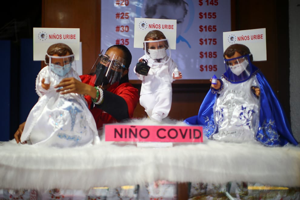 在墨西哥市的一間商店內,一名店員正在替耶穌寶寶娃娃戴上口罩和面罩,藉此推廣防疫的重要。