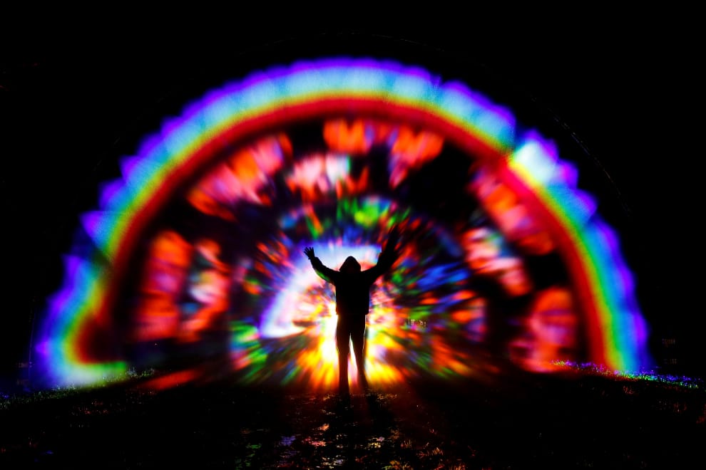 在西薩塞克斯的斯泰寧鎮(Steyning),英國藝術家克雷格(Benjamin Clegg)的互動藝術作品〈黑暗中的彩虹〉(Rainbow in the Dark)正在展出。