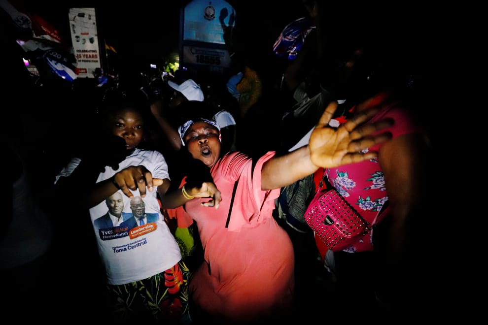 在首都阿克拉(Accra),民眾開心地在現任總統阿庫福-阿多(Nana Akufo-Addo)的官邸旁跳舞,慶祝他贏得這次的總統大選。