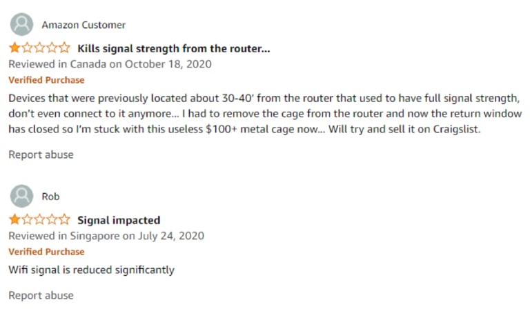 既然說法拉第籠可有效遮蔽電磁波,這產品基本功能就是遮蔽外面的電磁波到路由器,或是將路由器的電磁波關在籠子裡。這樣想想,不會覺得很奇怪嗎?因為 Wi-Fi 訊號就是電磁波,消費者買路由器的目的,不就是為了讓手機接收 Wi-Fi 訊號,為何又要買個籠子把訊號關起來?