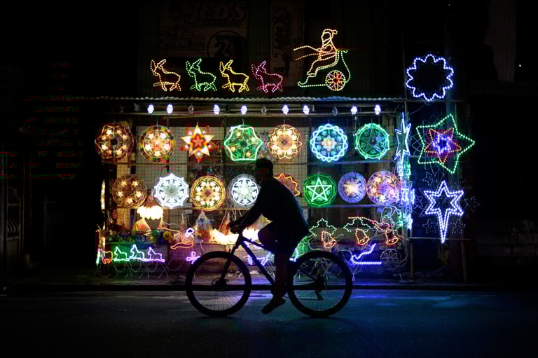 在位於馬尼拉大都會的拉斯皮納斯市(Las Pinas City),一名單車騎士騎過街頭的聖誕裝飾。