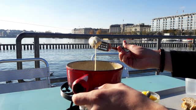 在當局宣布餐廳可以重新營業後,一名男子來到日內瓦的著名景點室外浴場(Les Bains des Paquis),對著萊芒湖(lac Léman)的美景大啖瑞士起司鍋。
