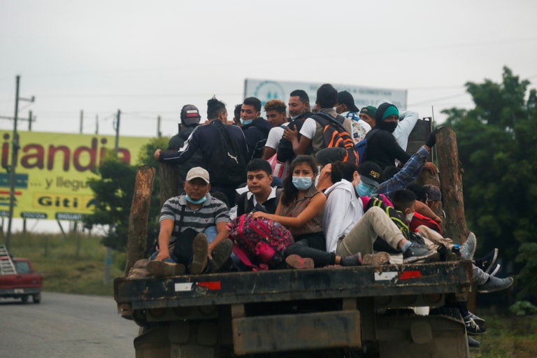 在靠近瓜地馬拉邊境的科潘省(Copan),「車隊移民」(Migrant Caravan)搭上卡車準備一路向北前往美國。