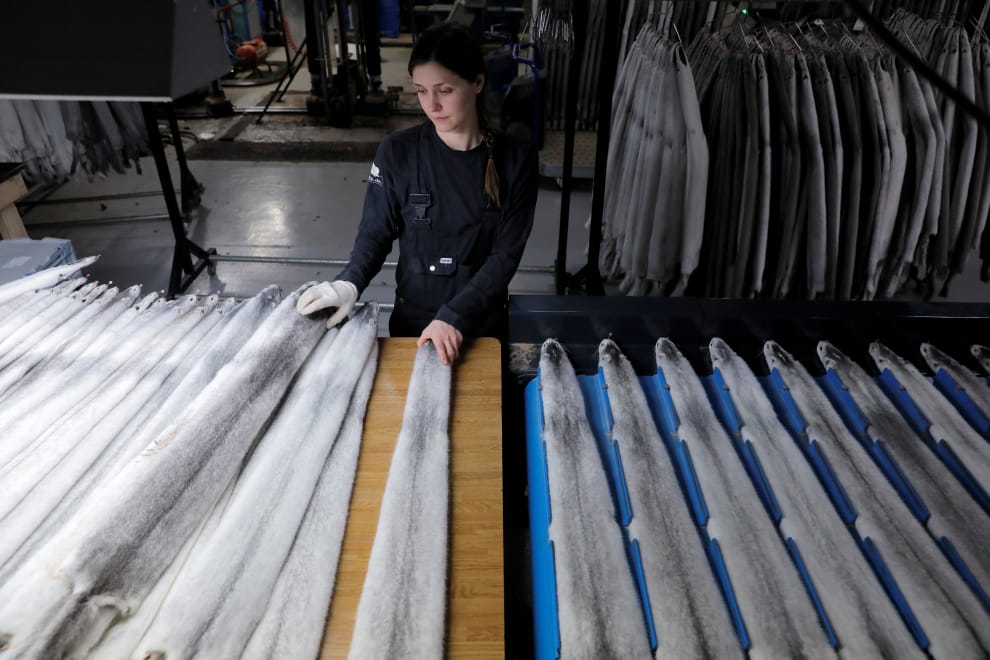 在日德蘭半島(Jutland)奧斯鎮(Aars)的水貂皮公司內,工作人員正在檢查水貂皮的品質。