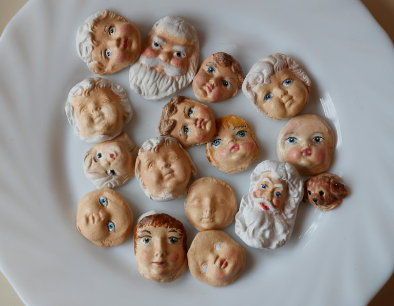 在首都基輔,烏克蘭藝術家潔拉申科(Maryna Gerashchenko)將剛做好的聖誕人偶小臉放在瓷盤上。