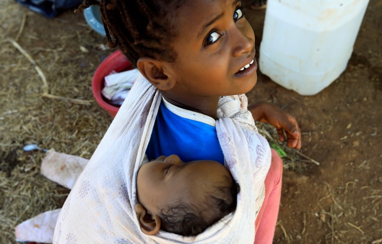 在靠近衣索比亞邊界的加達里夫州(Al-Qadarif state),一名逃離衣索比亞提格雷州(Tigray State)的孩童揹著手足在難民營內暫居。