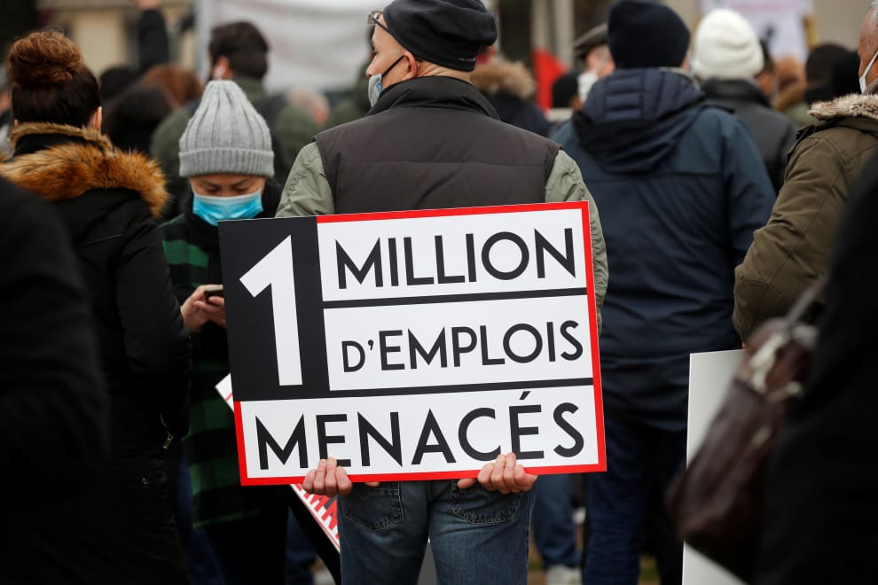 在巴黎街頭,餐廳、咖啡館、酒吧、夜店老闆齊聚一堂,抗議政府的防疫封鎖措施威脅他們的生計。其中,一名民眾手拿寫有「百萬工作受威脅」標語的牌子參加示威。