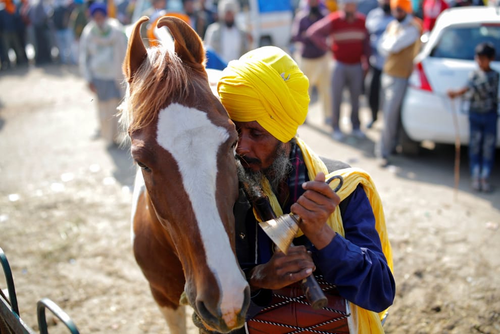 在首都新德里外圍,一隻馬陪著主人一塊抗議農業改革。