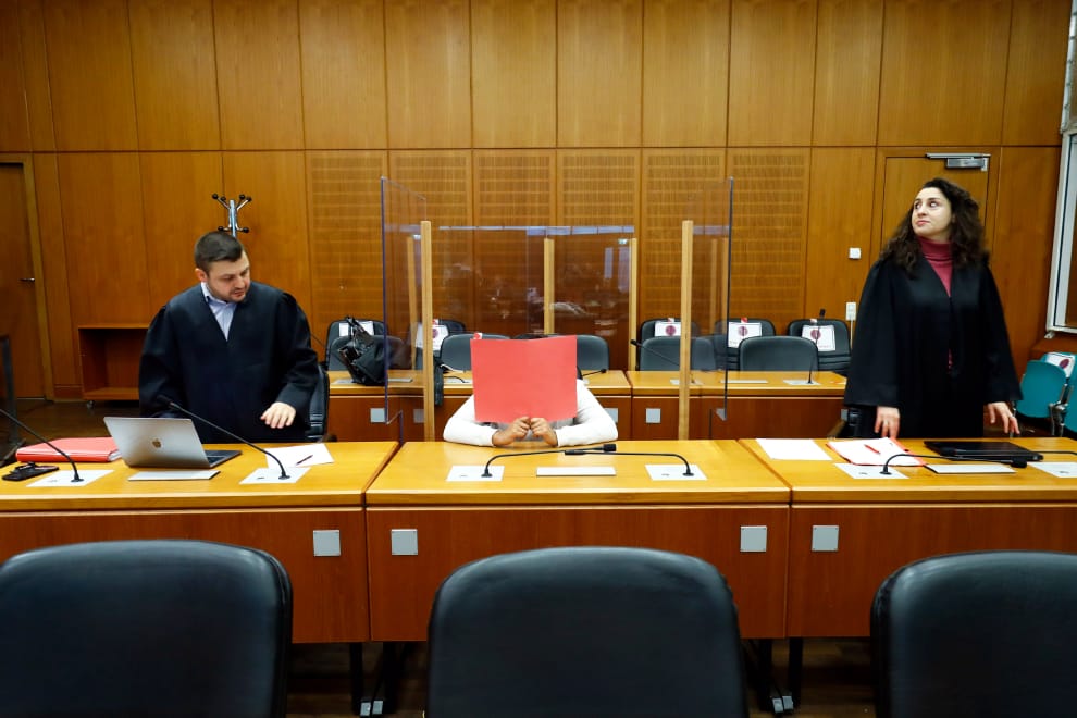在法蘭克福高等法院,被指控替恐怖組織伊斯蘭國(IS)做事的嫌犯納希姆.A(Nasim A.)用紅色的資料夾擋住臉,在律師的陪同下接受審判。