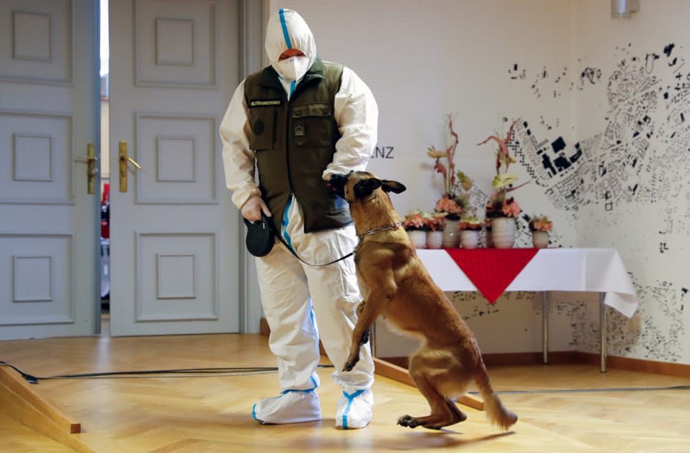在維也納舉辦的記者會上,當局向媒體展示了他們訓練有成的檢疫犬范特西(Fantasy),牠可以靠著鼻子聞出誰可能是COVID-19(武漢肺炎)患者。