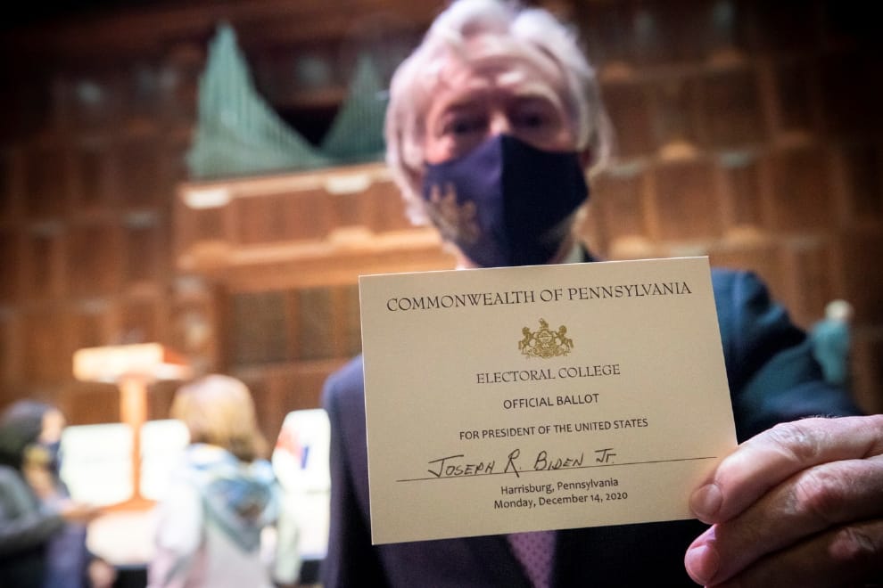 在賓州舉辦的選舉人團(Electoral College)會議上,選舉人們照著 11月3日美國總統大選時,賓州選民的意志將選舉人票投給了民主黨總統候選人拜登(Joseph R. Biden)和他的副手賀錦麗(Kamala D. Harris),他倆將在明年 1月20日正式就職成美國第 46任正副總統。
