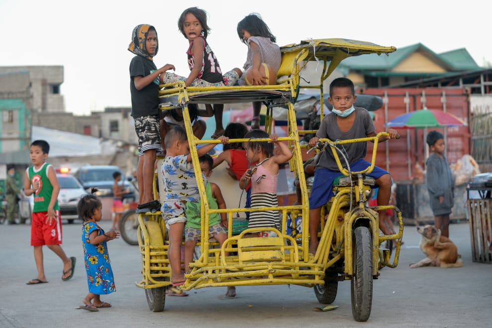 在馬尼拉大都會區的巴斯科區(Baseco compound),孩子們騎著人力車往前進。