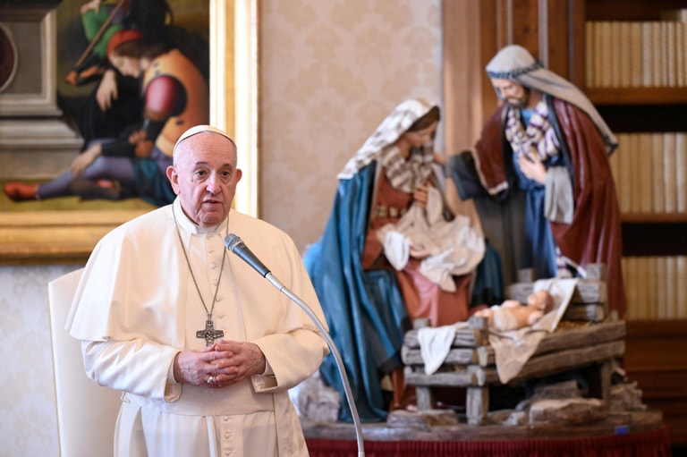 在宗座宮內的圖書館裡,羅馬天主教宗方濟各(Pope Francis)在「耶穌降生馬槽」布置前發表每周演說。