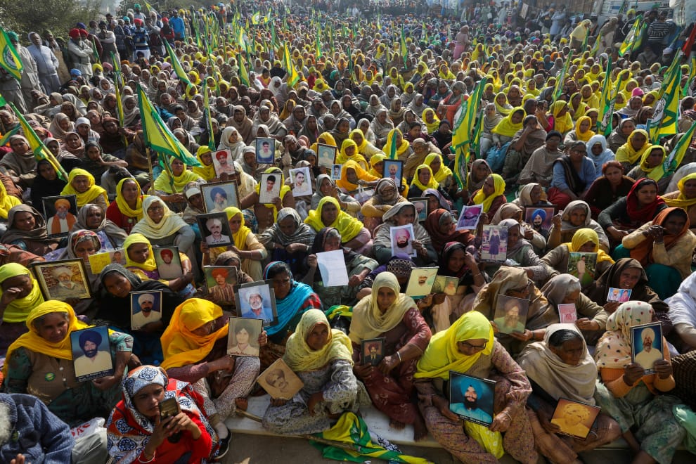 在靠近德里的提克里邊界(Tikri border),大批婦女拿著丈夫的遺照抗議政府的農業改革,她們的丈夫都是農夫,因為近年來收成不佳加上燃料、化肥成本上漲而負債累累,最後走上絕路。