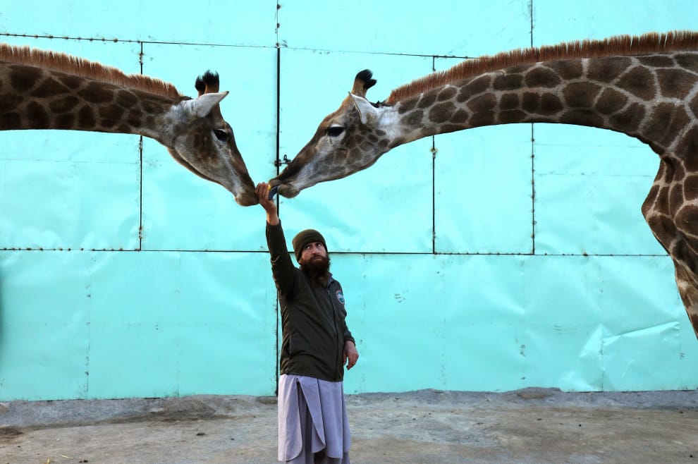 在位於北部的白沙瓦市(Peshawar),動物園工作人員正在餵長頸鹿們吃飯。
