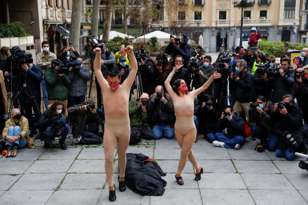 在位於馬德里的西班牙文化部前,佛朗明哥小酒館協會的成員穿著肉色的貼身衣物大跳佛朗明哥,抗議政府的防疫封鎖令讓提供佛朗明哥表演的小酒館無法營業,也讓他們的生計出問題。