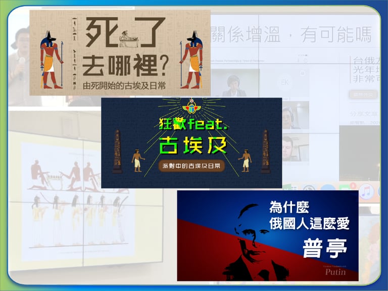 除了直播聊天,在今年的文化主題講座,我們回到古文明,要讓你知道埃及人都怎麼開趴,還有他們死後會到哪裡去,然後再來到現代,要跟你說說普亭先生的八卦日常。