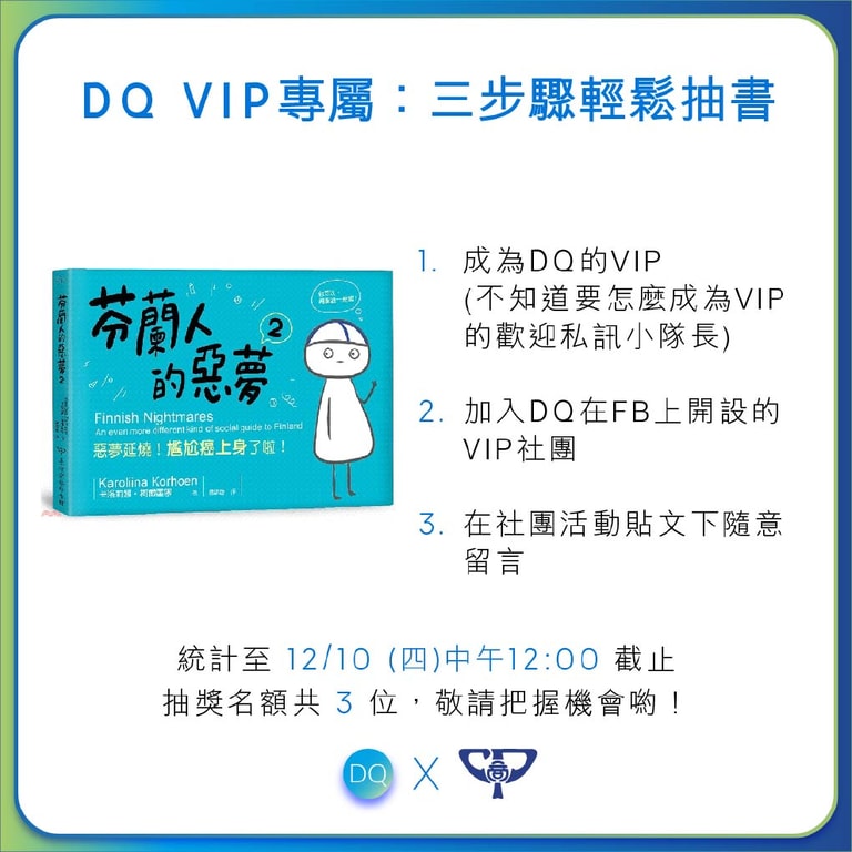此外,DQ VIP社團現在每個月都有小隊長私心選書+金石堂 3本選書的【地球圖書館】抽書活動,以這個月來說,我們配合站上文章〈討厭社交怕尷尬 「精芬文化」風靡中國〉,抽出了三本《芬蘭人的惡夢2》給有興趣的小隊員,過去也曾配合〈鍵盤戰士:網路酸民都在想什麼?〉一文,抽出兩本《鍵盤戰士》挪威攝影集給大家,讓在看完文章還意猶未盡的小隊員,可以透過地球圖書館把知識一次補完。