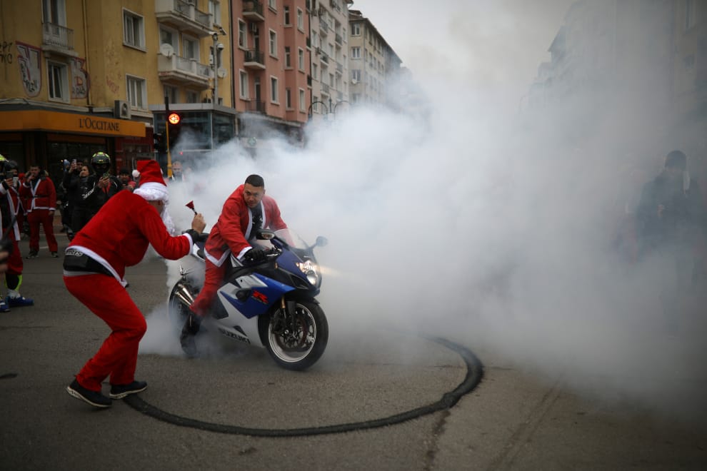 在保加利亞首都索非亞(Sofia),一群聖誕老人騎上機車,參加一年一度的聖誕老人機車大遊行。