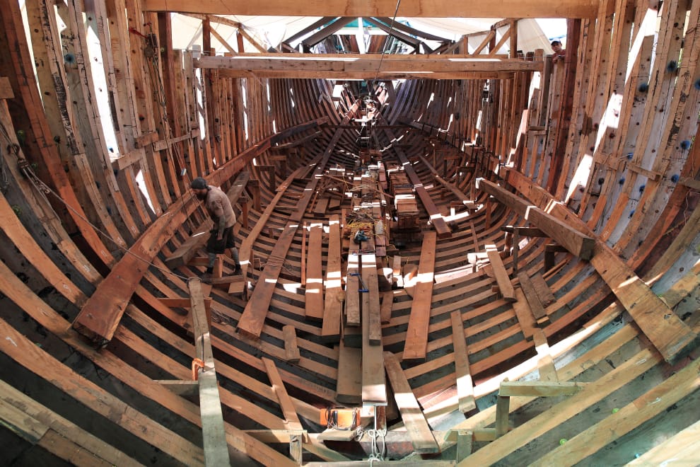 在哥斯大黎加莫拉萊斯角(Punta Morales)的一處拆船廠裡,一名男子正在努力建造一艘環保船隻。完工後,這艘船僅需靠太陽能、電力和水力等,便能在海上航行,進一步把這艘船的碳足跡降至將近 0的程度。