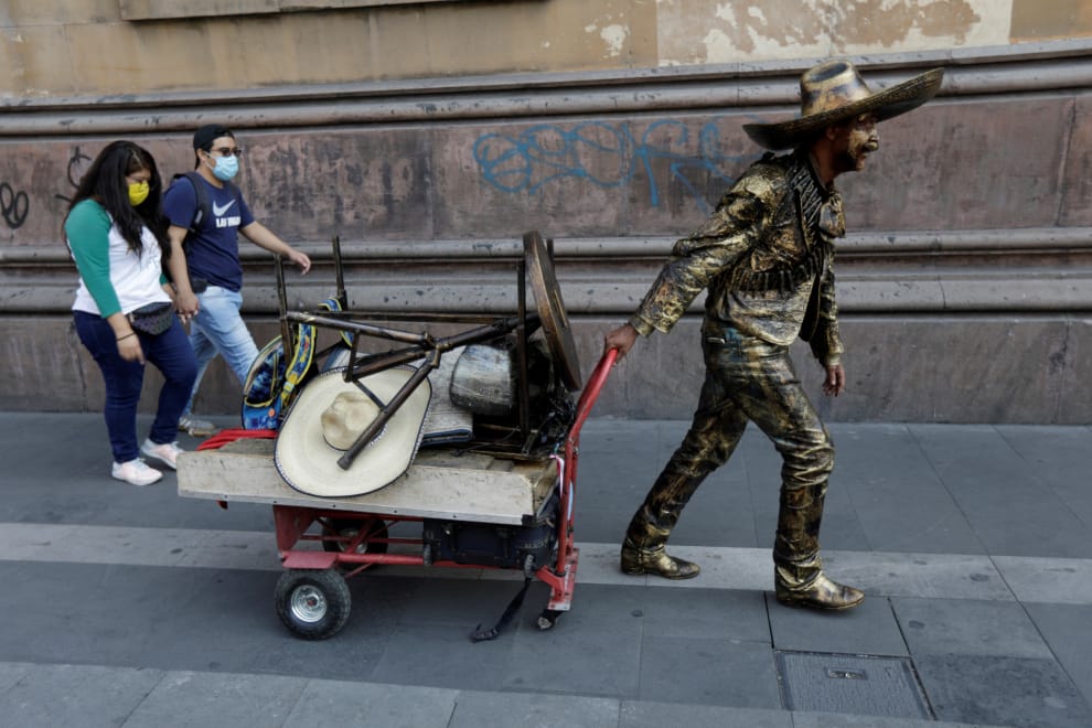 在墨西哥市,一名街頭藝人打扮成雕像的樣子,拉著一台拖車經過兩名路人身邊。
