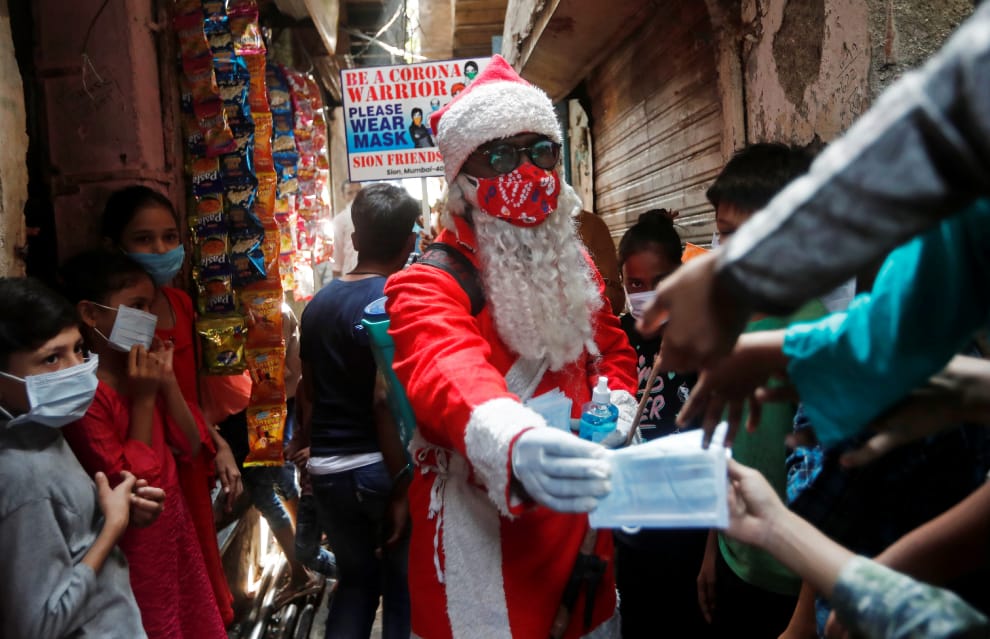 在印度大城孟買,一名聖誕老人走進貧民窟裡,發放免費口罩給孩子們。