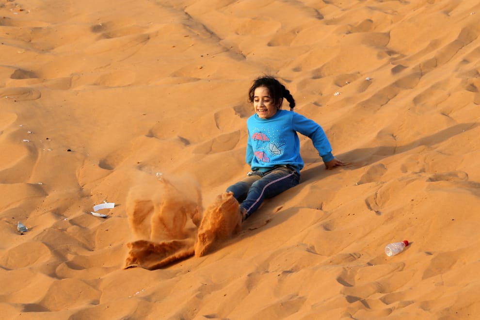 在沙烏地阿拉伯首都利雅德的薩馬公園(al-Thumama park),一名小女孩開心地從沙丘上一路滑了下來。