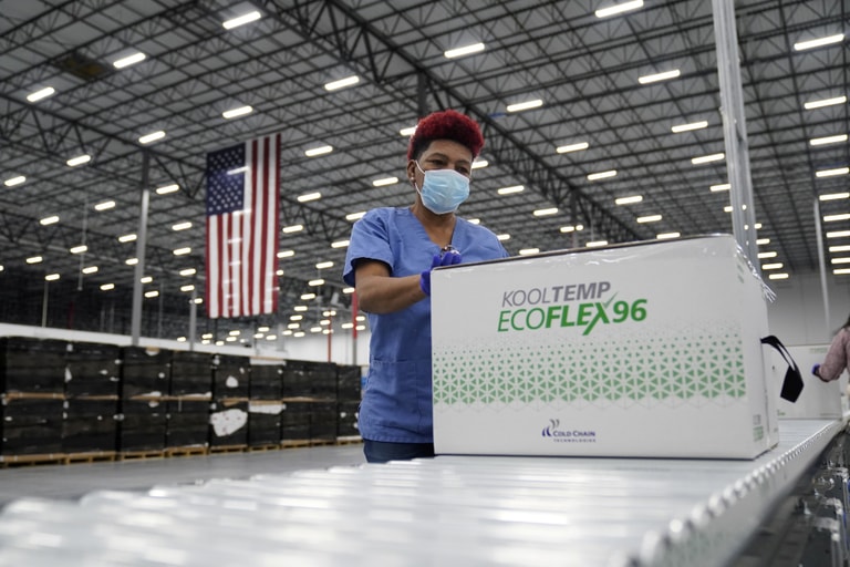 在美國密西西比州的麥克森(McKesson)疫苗配送中心,工作人員正在檢查一箱美國藥廠莫德納(Moderna)開發的疫苗,準備隨後送往各個醫療院所中使用。