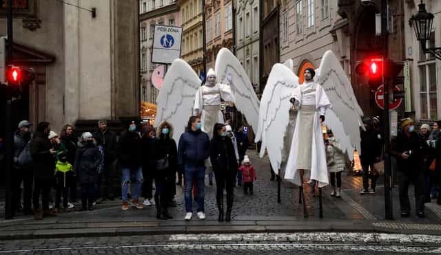 在捷克首都布拉格,兩名男子打扮成天使的樣子,踩上高蹺站在路人們中間。