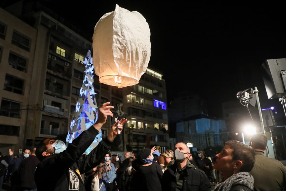 在黎巴嫩首都貝魯特的傑瑪澤(Gemmayzeh)地區,民眾聚在一棵點起燈的聖誕樹旁邊放天燈祈福。