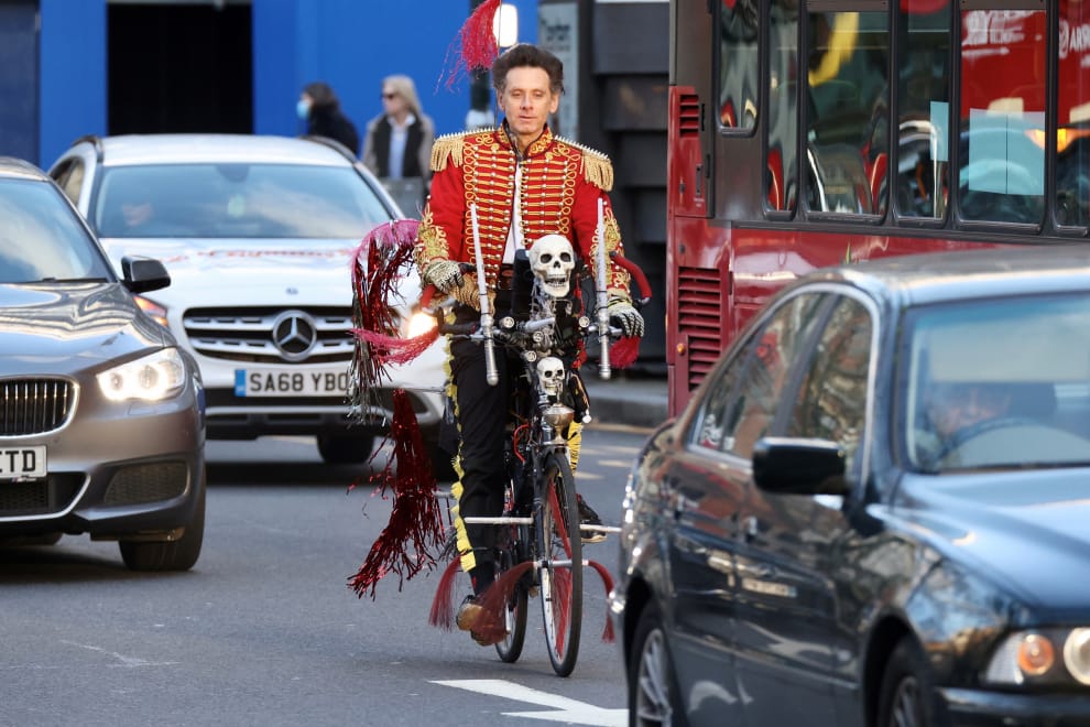 在英國首都倫敦雀兒喜區(Chelsea)的國王路(Kings Road)上,一名男子騎著插滿骷髏、旗幟的腳踏車出現在路上。