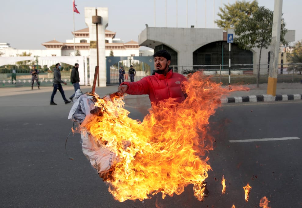 在位於尼泊爾首都加德滿都的國會大廈外,一名示威者在尼泊爾總統接受總理奧利(Khadga Prasad Sharma Oli)的請求宣布解散國會後,跑到國會大廈外揮舞著點燃的奧利肖像。
